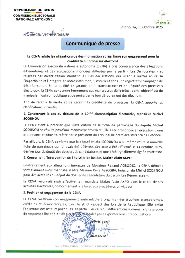 La CENA dément également les affirmations de Renaud Agbodjo, membre du parti Les Démocrates, selon lesquelles l’institution aurait mandaté Maître Maxime René Assogba, huissier de Michel Sodjinou, pour des actes liés au dépôt du dossier de candidature du parti. « La CENA n’a jamais mandaté Maître Assogba pour un tel acte », précise le communiqué. En revanche, elle confirme avoir effectivement fait appel à Maître Alain Akpo, huissier de justice, dans le cadre de ses activités électorales, conformément aux procédures légales.