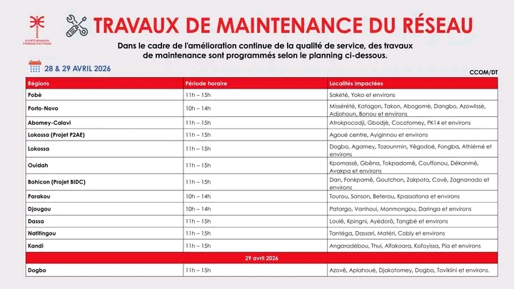 La fourniture de l’énergie électrique sera perturbée les mardi 28 et mercredi 29 avril 2026, entre 10 heures et 15 heures, dans plusieurs localités du Bénin. L’information a été rendue publique par la Société béninoise d’énergie électrique (SBEE) à travers un communiqué officiel.