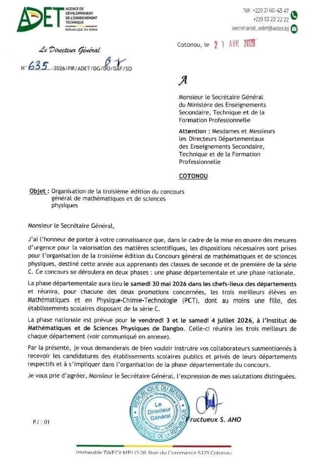 Selon ladite note, cette compétition s’adresse aux élèves des classes de Seconde et de Première C des établissements publics et privés. Le concours se déroulera en deux étapes, avec une phase départementale prévue le samedi 30 mai 2026 dans les chefs-lieux des départements, suivie d’une phase nationale les 3 et 4 juillet 2026 à l’Institut de Mathématiques et de Sciences Physiques de Dangbo.