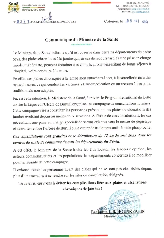 Le ministère de la Santé béninois, à travers le Programme national de lutte contre la lépre et l’ulcère de buruli, organise du 12 au 30 mai 2025, une campagne gratuite de consultations foraines à l’endroit des personnes souffrant de plaies chroniques à la jambe et évoluant depuis au moins deux semaines. Ces consultations se dérouleront dans les centres de santé de commune de tous les départements du Bénin. L’information a été rendue publique à travers un du ministère de la santé dont voici l’intégralité 👇