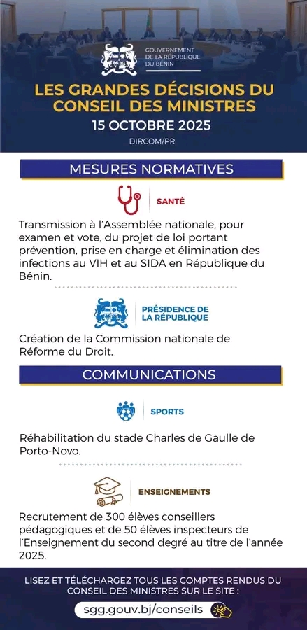 Bénin : les grandes décisions du conseil des ministres de ce mercredi 15 octobre 2025 15 octobre 2025 | No Comments | Actualité