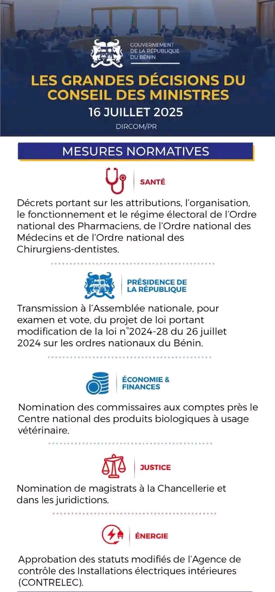 Bénin : les grandes décisions du conseil des ministres de ce mercredi 16 juillet 2025 16 juillet 2025 | No Comments | Actualité, Politique