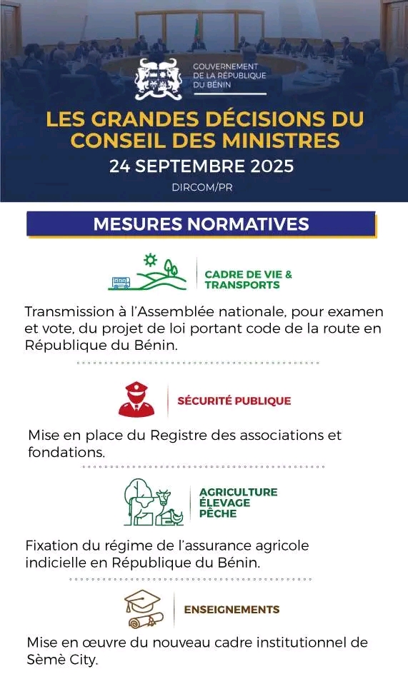 Bénin : les grandes décisions du conseil des ministres de ce mercredi 24 septembre 2025 24 septembre 2025 | No Comments | Actualité, Politique