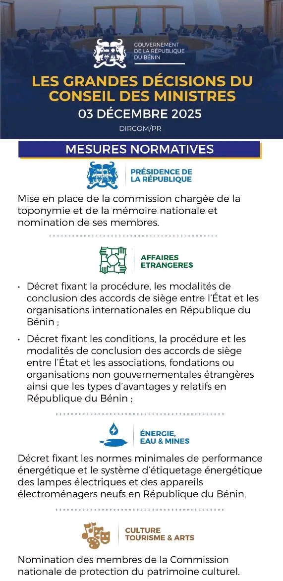 Bénin : les grandes décisions du conseil des ministres de ce mercredi 3 décembre 2025 3 décembre 2025 | No Comments | Actualité, Politique