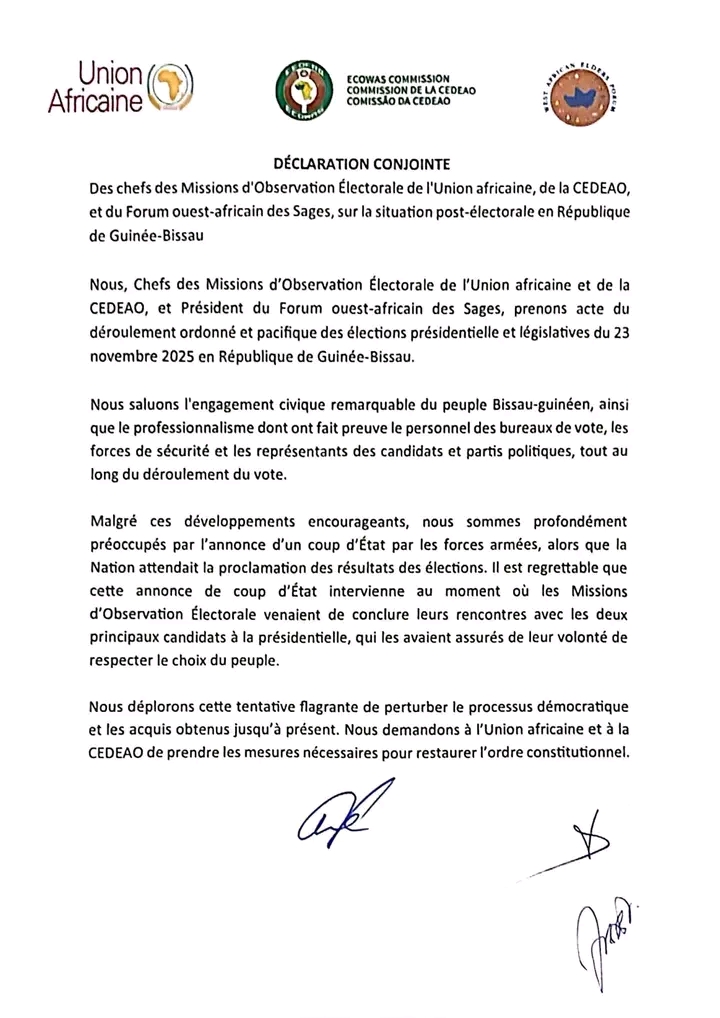 Les Chefs des Missions d’Observation Électorale de l’Union africaine, de la CEDEAO et le Président du Forum ouest-africain des Sages ont publié, ce 26 novembre 2025, une déclaration conjointe exprimant leur vive préoccupation face à la situation post-électorale en République de Guinée-Bissau.