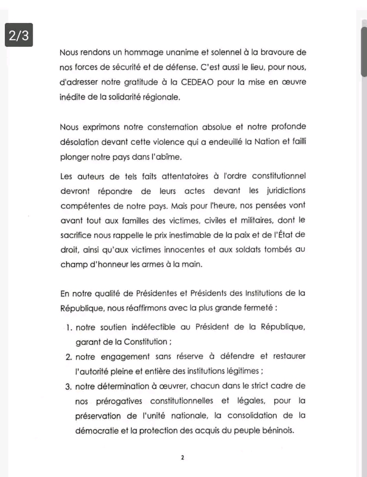 Les institutions de la République ont publié ce 9 décembre une déclaration solennelle après la tentative de coup d’État avortée du 7 décembre 2025. Elles dénoncent une « attaque intolérable » menée par une faction militaire ayant tenté de renverser les institutions, de bloquer le processus électoral en cours et de saper les fondements démocratiques du pays.