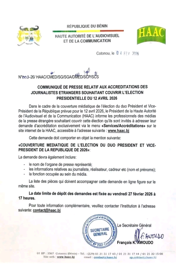À travers un communiqué, le président de l’institution invite les professionnels de la presse internationale concernés à soumettre leur demande d’accréditation exclusivement en ligne. La procédure doit être effectuée via le menu « Services/Accréditations » disponible sur le site officiel de la HAAC, à l’adresse www.haac.bj
