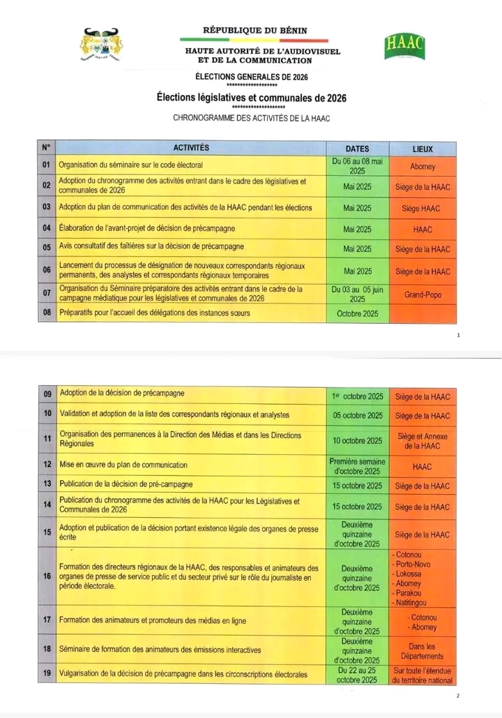 La Haute Autorité de l’Audiovisuel et de la Communication (HAAC) se met en ordre de bataille pour jouer pleinement son rôle dans le cadre des élections couplées législatives et communales de 2026 au Bénin. L’institution a dévoilé, ce mercredi 15 octobre 2025, au siège de Cotonou, le chronogramme de ses activités pour accompagner le processus électoral.