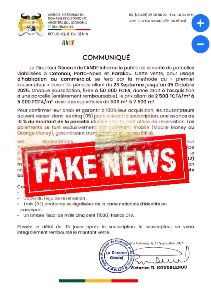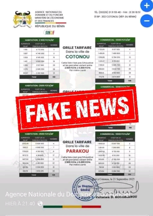 L’Agence nationale du Domaine et du Foncier (ANDF) alerte l’opinion publique sur la circulation de faux documents sur les réseaux sociaux depuis la matinée du 21 septembre 2025. Ces documents, comprenant un communiqué et une grille tarifaire prétendument signés du Directeur général de l’Agence, font croire à une mise en vente de parcelles dans les municipalités de Porto-Novo, Cotonou et Parakou.