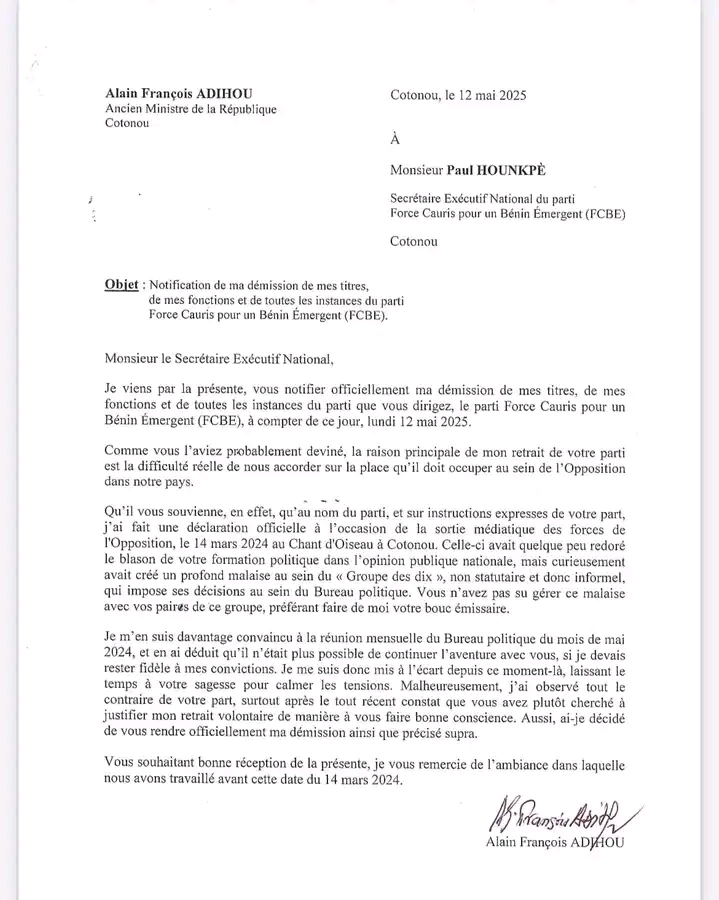 En effet, dans une lettre datée du lundi 12 mai 2025, adressée au Secrétaire National du parti, Paul Hounkpè, l’ex conseiller politique de la FCBE, Alain Adihou a expliqué les raisons de son départ en évoquant notamment des difficultés réelles d’accord sur la place que doit occuper la formation politique au sein de l’opposition. Retrouvez ci-dessous l’intégralité de sa lettre de démission publiée par Bip radio 👇