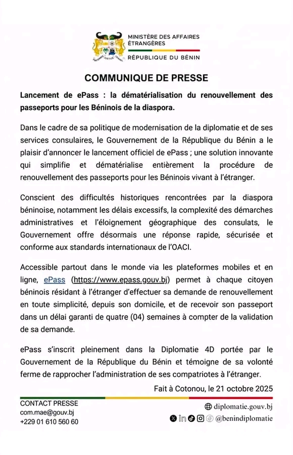 Le Gouvernement béninois a lancé ePass, une plateforme numérique permettant aux Béninois de la diaspora de renouveler leur passeport en ligne, sans se déplacer. L’annonce a été faite à travers un communiqué du Ministère des affaires étrangères en date du 21 octobre 2025.