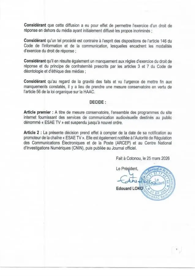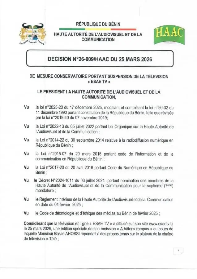 La Haute Autorité de l’Audiovisuel et de la Communication (HAAC) a prononcé, le 25 mars 2026, la suspension de la télévision en ligne « ESAE TV ». Cette décision conservatoire, rendue publique à travers la décision n°26-009, entraîne l’arrêt de l’ensemble des programmes diffusés par le média jusqu’à nouvel ordre.