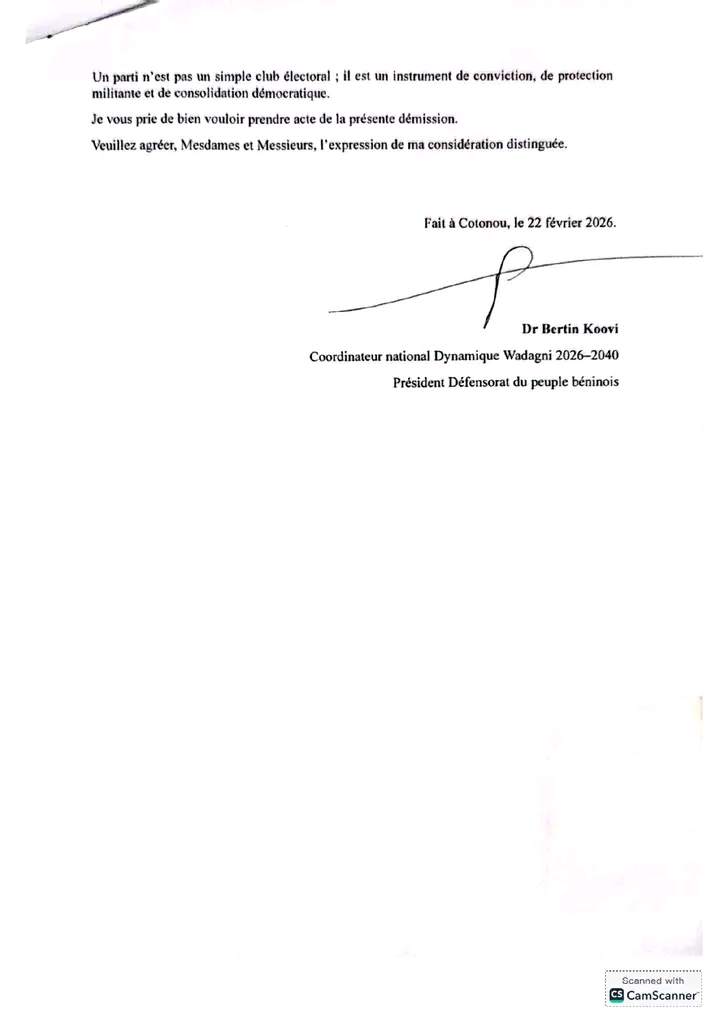 Dans une correspondance officielle adressée aux instances dirigeantes du parti, le Coordinateur national de la Dynamique Wadagni 2026-2040 justifie sa décision par la nécessité d’éviter toute confusion politique, en raison de son soutien public et assumé au ministre Romuald Wadagni, également soutenu par le parti.