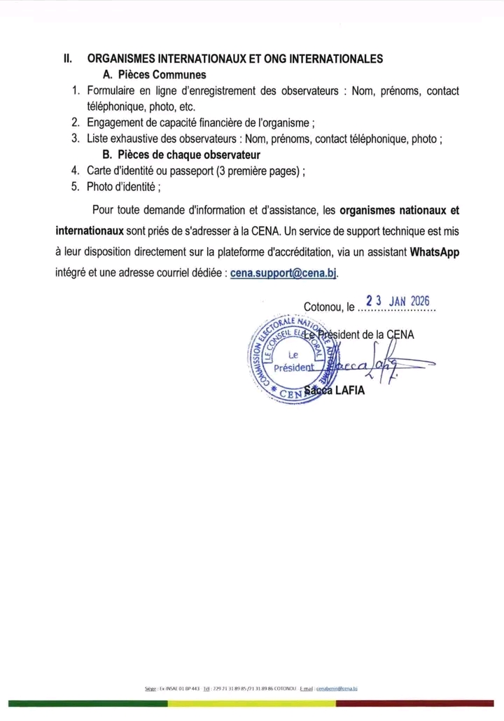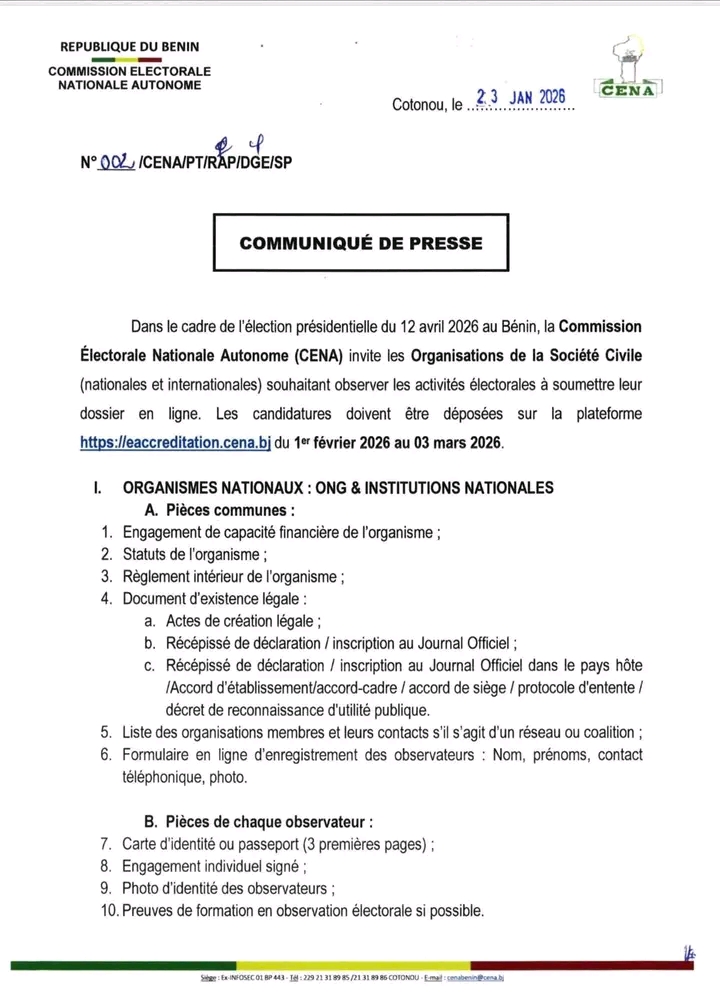 À travers un communiqué, l’institution électorale invite les organisations désireuses d’observer les différentes activités du processus électoral à soumettre leur dossier de candidature exclusivement en ligne. Les demandes d’accréditation devront être déposées sur la plateforme dédiée : https://eaccreditation.cena.bj du 1er février au 03 mars 2026.