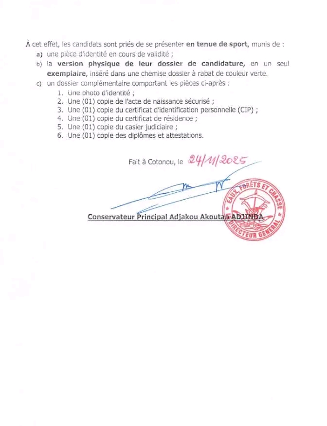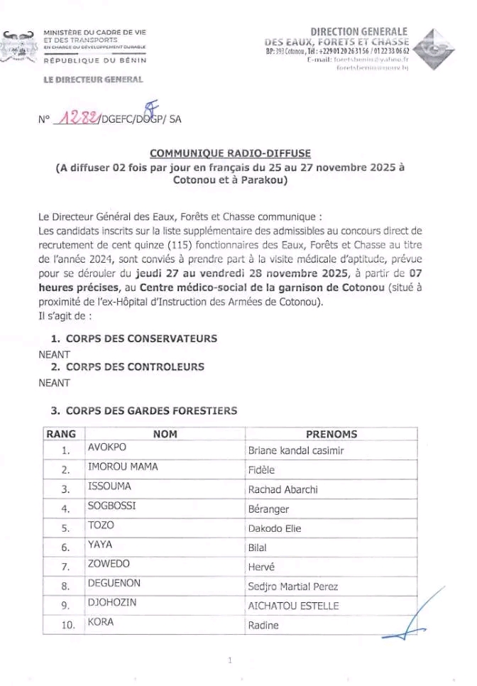 À travers un communiqué en date du 24 novembre 2025, le Directeur Général des Eaux, Forêts et Chasse invite les candidats inscrits sur la liste supplémentaire des admissibles au concours direct de recrutement de 115 fonctionnaires au titre de l’année 2024, à prendre part à la visite médicale d’aptitude, prévue pour se dérouler du jeudi 27 au vendredi 28 novembre 2025, à partir de 07 heures précises, au Centre médico-social de la garnison de Cotonou (situé à proximité de l’ex-Hôpital d’Instruction des Armées de Cotonou).