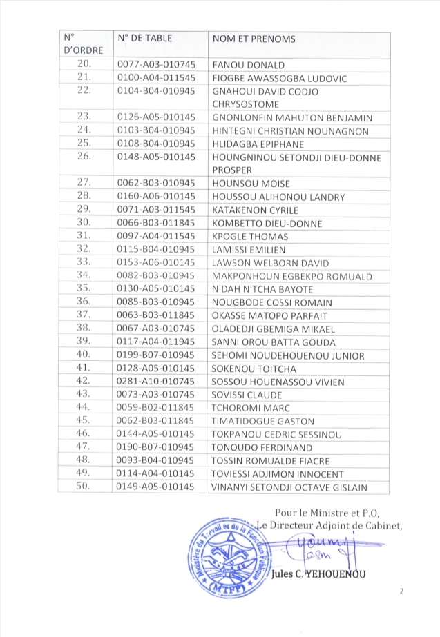 À travers un communiqué en du 18 août 2025, le Ministre du travail et de la fonction publique porte à la connaissance des candidats ayant postulé pour l’accès au corps des Conducteurs de véhicules administratifs (CVA) et admissibles à la phase écrite du concours de recrutement de cent soixante-douze (172) fonctionnaires de l’État au profit du Ministère de l’économie et des finances, session des samedi 19 et dimanche 20 juillet 2025, dont les noms suivent, que la phase pratique de conduite aura lieu le jeudi 21 août 2025 à partir de 07 heures précises à la Direction départementale des Transports terrestres (DDTT) sise à Akpakpa à Cotonou. Ci-dessous la liste complète des concernés 👇