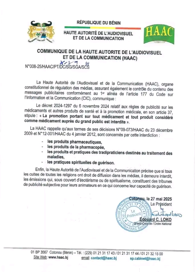 Au Bénin, la publicité et la promotion des produits pharmaceutiques, de pharmacopée et des pratiques spirituelles de guérison sont interdites selon le décret 2024-1297 du 6 novembre 2024, relatif aux règles de publicité sur les médicaments et autres produits de santé et à la promotion médicale. Le rappel a été fait par la Haute Autorité de l’Audiovisuel et de la Communication (HAAC), à travers un communiqué dont voici l’intégralité 👇