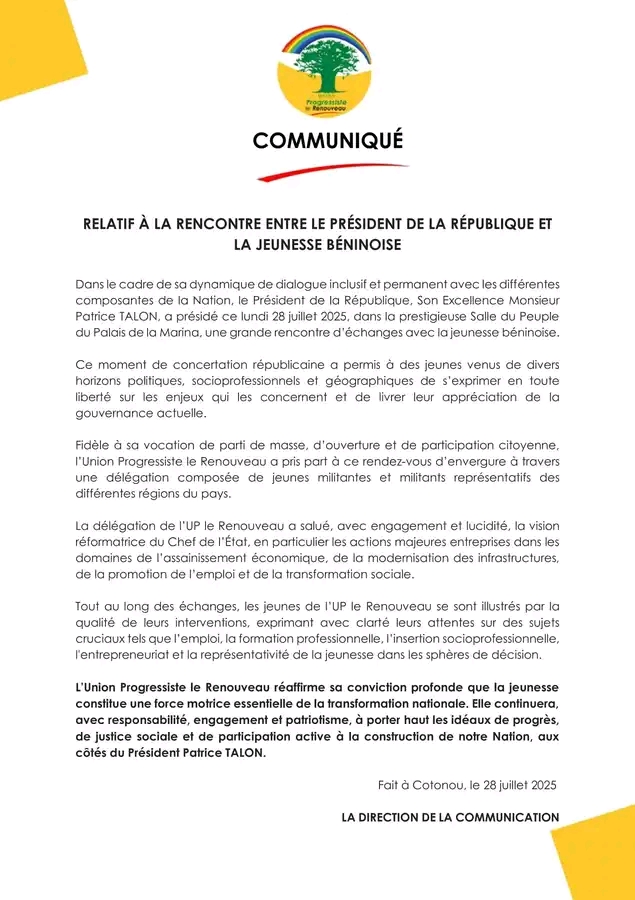 Le Président de la République, Patrice Talon, a présidé ce lundi 28 juillet 2025 dans la prestigieuse Salle du Peuple du Palais de la Marina, une importante rencontre d’échanges avec la jeunesse béninoise. À l’issue de ce dialogue qui s’inscrit dans la dynamique d’écoute et d’inclusion prônée par le chef de l’État, les jeunes de l’Union Progressiste le Renouveau ont salué avec engagement et lucidité, la vision réformatrice du chantre de la rupture.