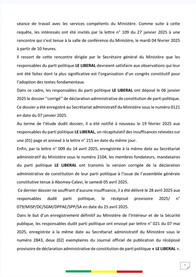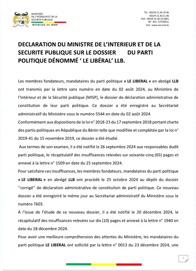 Le ministre de l’Intérieur a révélé dans la soirée de ce jeudi 15 mai, des irrégularités dans le processus de reconnaissance du parti politique “Le Libéral”, lancé le 5 avril 2025 par Richard Boni Ouorou.