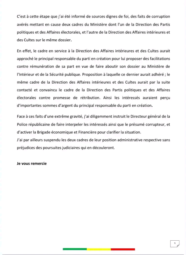 Les deux cadres du ministère ont été suspendus de leur position administrative respective et le Directeur général de la Police républicaine a été instruit de faire interpeler les intéressés ainsi que le présumé corrupteur, et d’activer la Brigade économique et Financière pour clarifier la situation. Retrouvez ci-dessous, l’intégralité de la déclaration du ministre Allasane Seïdou 👇